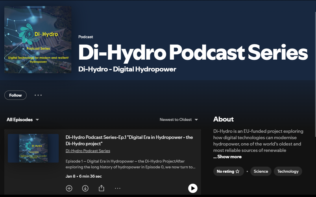 The Di-Hydro Podcast Series takes listeners on a journey from the historical origins of hydropower to where it is now, and, most importantly, where is it going. Through accessible yet technically grounded discussions, the series explores how technologies such as sensors, Artificial Intelligence, predictive analytics, and Digital Twins can change how hydropower plants are operated, maintained, and integrated into modern energy systems.